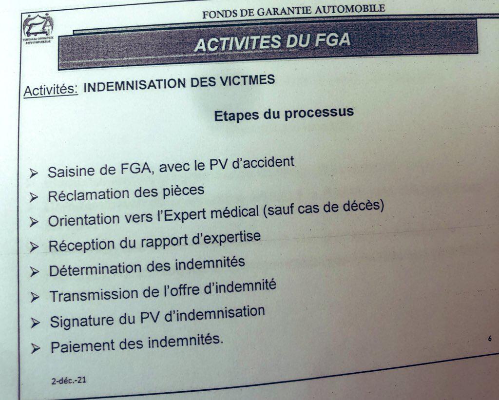 Il s’agit dans l’ordre de la saisine du FGA avec le procès-verbal (PV) de l’accident, suivie de la réclamation des différentes pièces nécessaires, l’orientation de la victime vers un expert médical (sauf en cas de décès), la réception du rapport d’expertise, la détermination des indemnités, la transmission de l’offre d’indemnité, la signature du PV d’indemnisation. Ce n’est qu’après ces étapes que vient le paiement des indemnités.