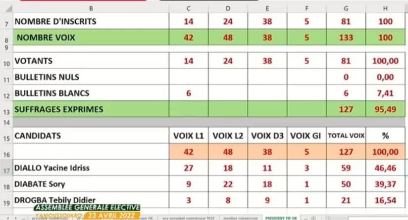Arrivés respectivement 1er avec 59 voix et 2ème avec 50 voix, les candidats Yacine Idriss Diallo et Sory Diabaté ont été admis à un second tour. Les votes ont tourné à l'avantage du 1er cité, qui a été élu nouveau président de la Fédération Ivoirienne de Football (FIF).