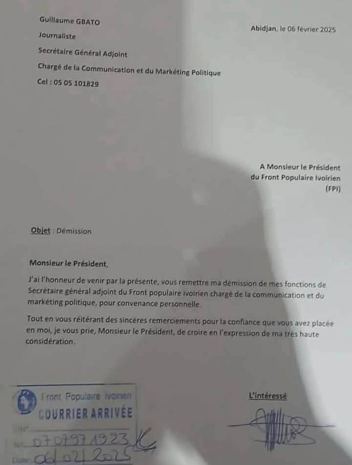 Le divorce entre Guillaume Gbato et la direction du Front populaire ivoirien (FPI) est acté. Le jeudi 6 février 2025, l'ex-directeur général de La Refondation, limogé le 4 février 2025 a remis sa lettre de démission au président du Front populaire ivoirien (FPI), Pascal Affi N’Guessan.