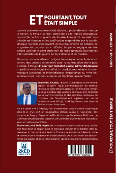 Plus qu’un simple récit, ce livre est un appel à la paix. Il nous rappelle que, sans elle, la vie perd tout son sens. Edmond k. Kouassi, jeune cadre de l’administration ivoirienne, mêle dans ses œuvres sa carrière professionnelle et son engagement littéraire, avec déjà trois publications à son actif : "L'Amoureux Malheureux" (2016), "La Rose de rose" (2024), et "Et pourtant, tout était simple" son dernier ouvrage.