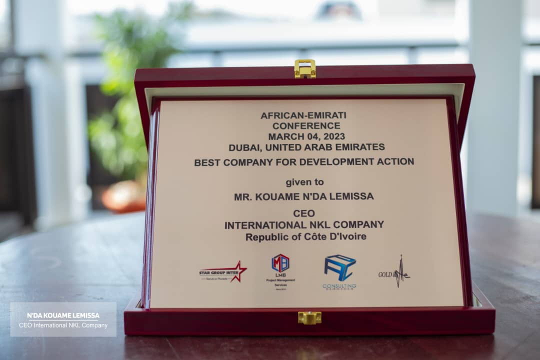 Toujours dans la dynamique d’une jeunesse consciente et bâtisseuse de l’avenir, le PDG de NKL International Company, N’Da Kouamé Lemissa vient de voir les efforts de sa structure récompensés à Dubaï par le prix « Best Company For Developement Actions », (Meilleure Compagnie d’Actions et de Développement). C'était au cours du dîner gala de la 5e édition de ‘’African Emirati Company’’, le samedi 04 mars 2023, au Carlton Tower Hotel.