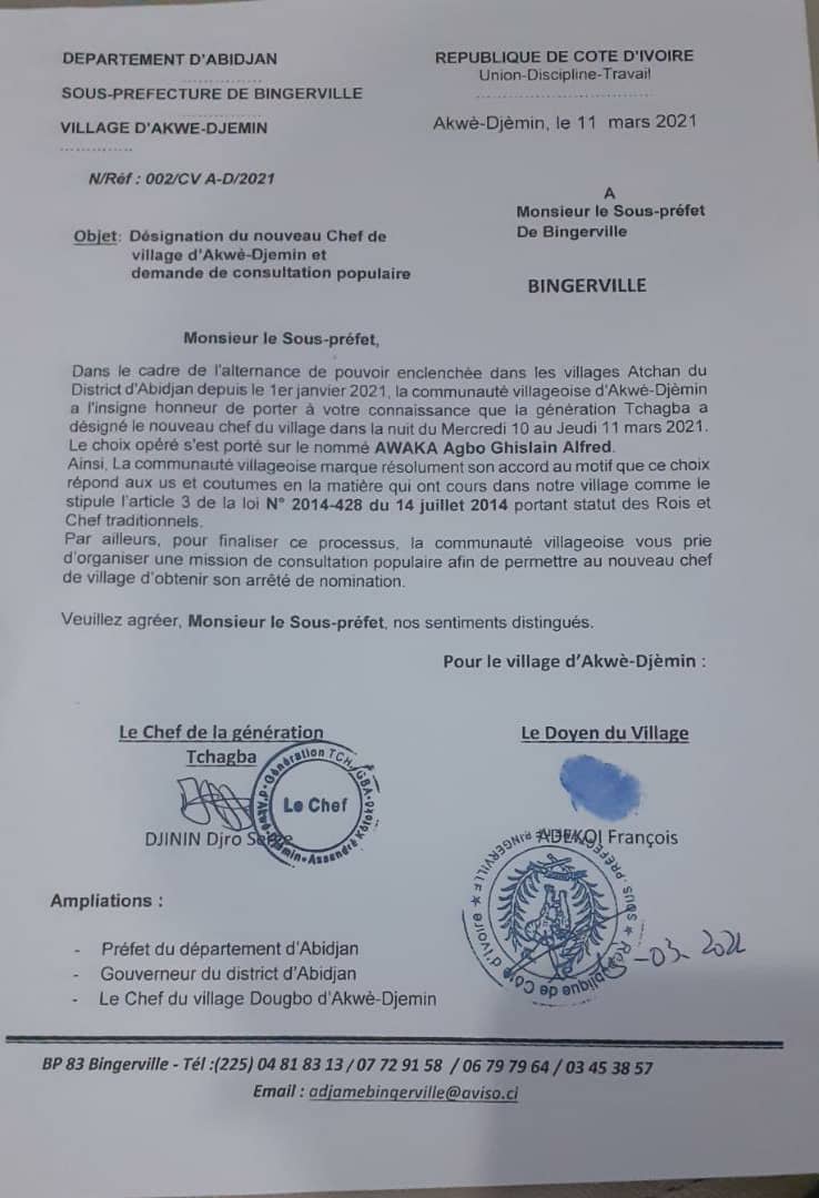 « Dans le cadre de l’alternance du pouvoir enclenchée dans les villages Atchan du District d’Abidjan, depuis le 1er janvier 2021, la communauté villageoise d’Akouè-Djèmin a l’insigne honneur de porter à votre connaissance que la génération Tchagba a désigné le nouveau chef du village dans la nuit du mercredi 10 au jeudi 11 mars 2021. Le choix opéré s’est porté sur le nommé Awaka Agbo Ghislain Alfred. Ainsi, la communauté villageoise marque résolument son accord au motif que ce choix répond aux us et coutumes en la matière, qui ont cours dans notre village comme le stipule l’article 3 de la loi 2014 - 428 du 14 juillet 2014, portant statut des Rois et Chefs traditionnels. Par ailleurs, pour finaliser ce processus, la communauté villageoise vous prie d’organiser une mission de consultation populaire afin de permettre au nouveau chef de village d’obtenir son arrêté de nomination », tel était la substance du courrier signé du chef de la génération Tchagba, Djinin Djoro Serge et du chef de terre, Nanan Adékoi François, puis adressé au Sous-Préfet avec ampliation au Préfet du département d’Abidjan, au Gouverneur du District d’Abidjan et au chef du village de la génération Dougbo d’Akouè-Djèmin.