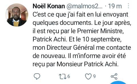 Et le 10 septembre, mon Directeur Général me contacte de nouveau. Il m’informe avoir été reçu par Monsieur Patrick Achi. Lors de notre entretien téléphonique, il m’explique qu’un ‘’tel papier pourrait faire des amalgames parce qu’il y a une bataille pour la présidentielle de 2025 au RHDP. Les gens disent qu’il n’est pas un pur produit du RDR. Donc, un tel papier pourrait lui causer un très grand préjudice alors qu’il n’a rien commis comme faute’’. Il poursuit en ces termes ‘’Il (Monsieur Patrick Achi) nous demande de regarder, s’il n’y a pas d’autres éléments, si c’est ça seulement, ce n’est pas nécessaire de faire une publication là-dessus parce qu’il n’y a aucune faute qui a été commise’’. (…) Suite à notre entretien téléphonique, j’avais clairement compris que la publication de mon enquête dans L’Eléphant Déchaîné était compromise (…)