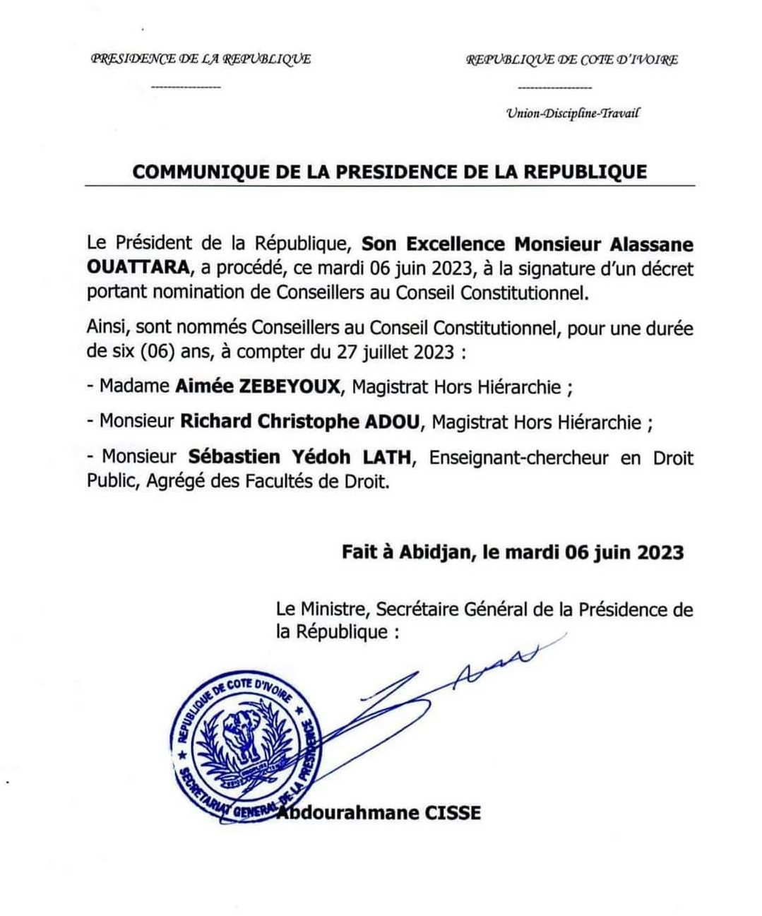 « Le Président de la République, SEM Monsieur Alassane Ouattara a procédé ce mardi 06 juin 2023 à la signature d'un décret portant nomination au Conseil constitutionnel », a annoncé un communiqué de la présidence ivoirienne.