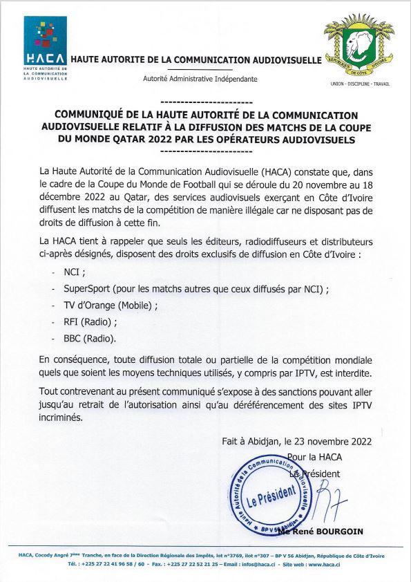 Me Réné Bourgoin, président de la Haute Autorité de la Communication Audiovisuelle (HACA), a interpellé, le mercredi 23 novembre 2022, les services audiovisuels exerçant en Côte d’Ivoire et qui diffusent de manière illégale la Coupe du Monde de la FIFA Qatar 2022.