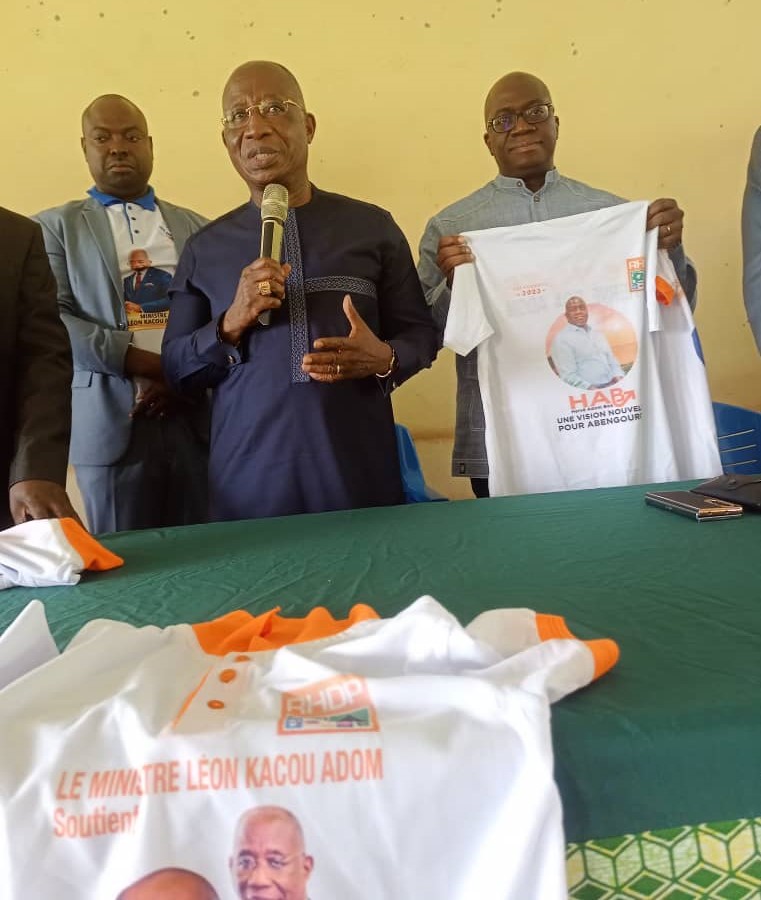 Le ministre Léon Kacou Adom a, séance tenante, apporté un soutien matériel de 10 motos, 3200 tenues (tee-shirts et polos) et deux grosses enveloppes aux candidats Wouadja Essay et Adom Hervé, respectivement candidat au Conseil Régional et à la mairie d’Abengourou.