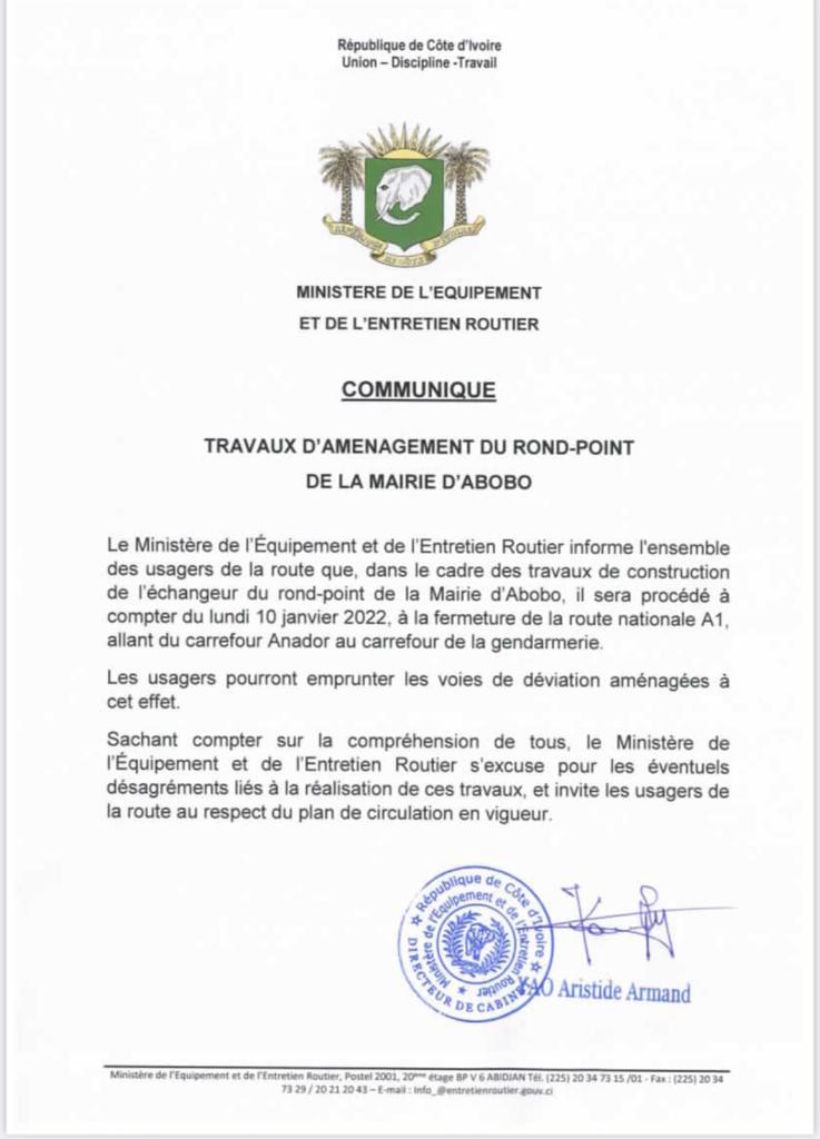 « Le ministère de l'Equipement et de l'Entretien Routier informe l'ensemble des usagers de la route que, dans le cadre des travaux de construction de l'échangeur du rond-point de la mairie d'Abobo, il sera procédé à compter du lundi 10 janvier 2022 à la fermeture de la route nationale A1, allant du carrefour Anador au carrefour de la gendarmerie.