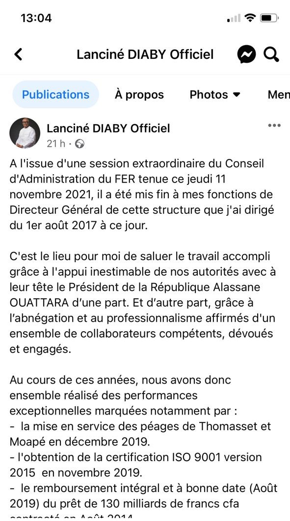 Le directeur général du Fonds d’Entretien Routier (FER) depuis le 1er aout 2017, Lanciné Diaby a été limogé le jeudi 11 novembre 2021 au cours d’un conseil d’Administration extraordinaire. Il était sur la touche depuis plusieurs mois, après la découverte d’un trou de plusieurs milliards de Fcfa lors d’un contrôle d’audit effectué par l’Inspection Générale de l’Etat. Il est remplacé à ce poste par Annick Tohe Lasmel, comme intérimaire. Alors que 264 Petites et Moyennes Entreprises (PME) réclament près de 200 milliards de F CFA au FER, l’ex-DG du FER a trouvé le moyen de se féliciter sur les réseaux sociaux.