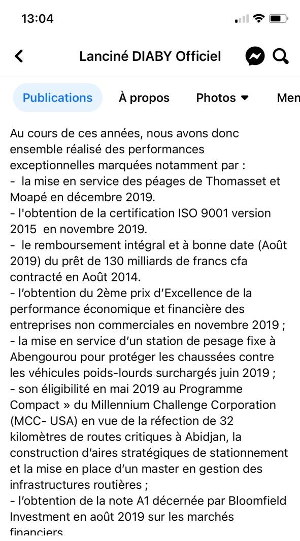 « C’est le lieu pour moi de saluer le travail accompli grâce à l’appui inestimable de nos autorités avec à leur tête le Président de la République Alassane Ouattara d’une part. Et d’autre part, grâce à l’abnégation et au professionnalisme affirmés par un ensemble de collaborateurs compétents, dévoués et engagés. Au cours de ces années, nous avons donc ensemble réalisé des performances exceptionnelles (…) Nous avons aussi permis à des communautés de bénéficier du fruit de notre travail à travers des actions sociales à portée éducatives, médicales, etc (…) C’est une page qui se tourne certes, mais elle ouvre le champ à de nombreuses perspectives selon le plan de Dieu, car je suis avant tout un serviteur de l’Etat. Je me tiens donc à l’entière disposition de la République pour lui rendre tout ce qu’elle a pu me permettre d’acquérir en matière de formation, d’expériences et de compétences. Et cela se traduira dans un premier temps par la reprise de mes activités parlementaires et la poursuite de mon action municipale, pour renforcer mes engagements en faveur des populations de la Circonscription 124 en général et de Samatiguila en particulier », a écrit Lanciné Diaby.