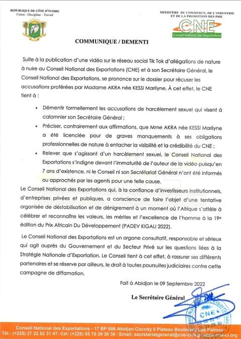 Suites à ses accusations contre Serge Martial Bombo, secrétaire général du Conseil National des Exportations (CNE), via une vidéo sur les réseaux sociaux, dénonçant des faits de harcèlement sexuel, le jeudi 8 septembre 2022, Mme Akra née Kessi Dexter Marilyne, est revenu à la charge le dimanche 11 septembre 2022. Cette-fois, avec un exposé intégral des faits, elle contre-attaque le communiqué de démenti du harcèlement sexuel produit par l’institution. L'intégralité de son droit de réponse !