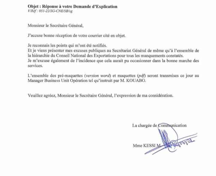 J’ai répété que je ne refusais pas d’élaborer le document mais qu’il prenne en considération les recommandations que je formulais en tant que Responsable de Communication et du Partenariat donc garante de la notoriété et de l’image du CNE. Et je lui ai également retorquée que je souhaitais conserver les droits d’auteurs entier de la dépêche qui demeure ma propriété suivant la loi N°2016-555 du 26 Juillet 2016 relative aux droits d’auteurs et aux droits voisins publié au journal officiel N° 84 de la République de Côte d’Ivoire, car j’étais le créateur-concepteur de la « Dépêche. » (lettre d’information) et du « Bulletin de l’Exportateur » ( web-magazine) diffusée sur les réseaux -sociaux. Toutefois, je lui rappelais toute ma disponibilité à intégrer les éléments qu’il demanderait d’inclure.