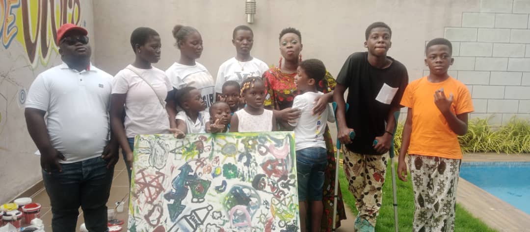 Les enfants en situation de handicap posant avec joie devant un tableau peint par eux (Ph : Mey)