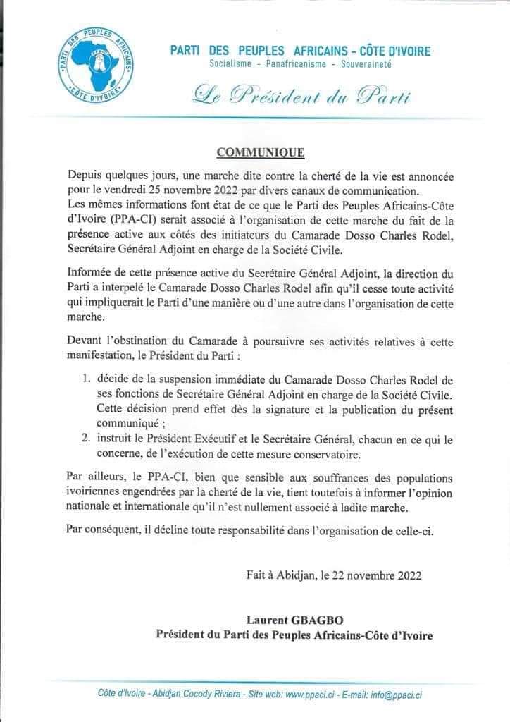 Pour le PPA-CI, l’implication de ce dernier dans l’organisation d’une marche contre la cherté de la vie, le vendredi 25 novembre 2022, font penser à une implication directe du parti dans cette activité.