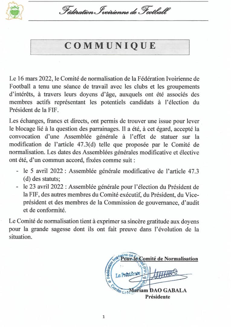 De même, l’Assemblée Générale élective du président de la FIF ; des autres membres du comité exécutif ; du président, du vice-président et des membres de la commission de gouvernance, d’audit et de conformité, a été fixée au samedi 23 avril 2022.