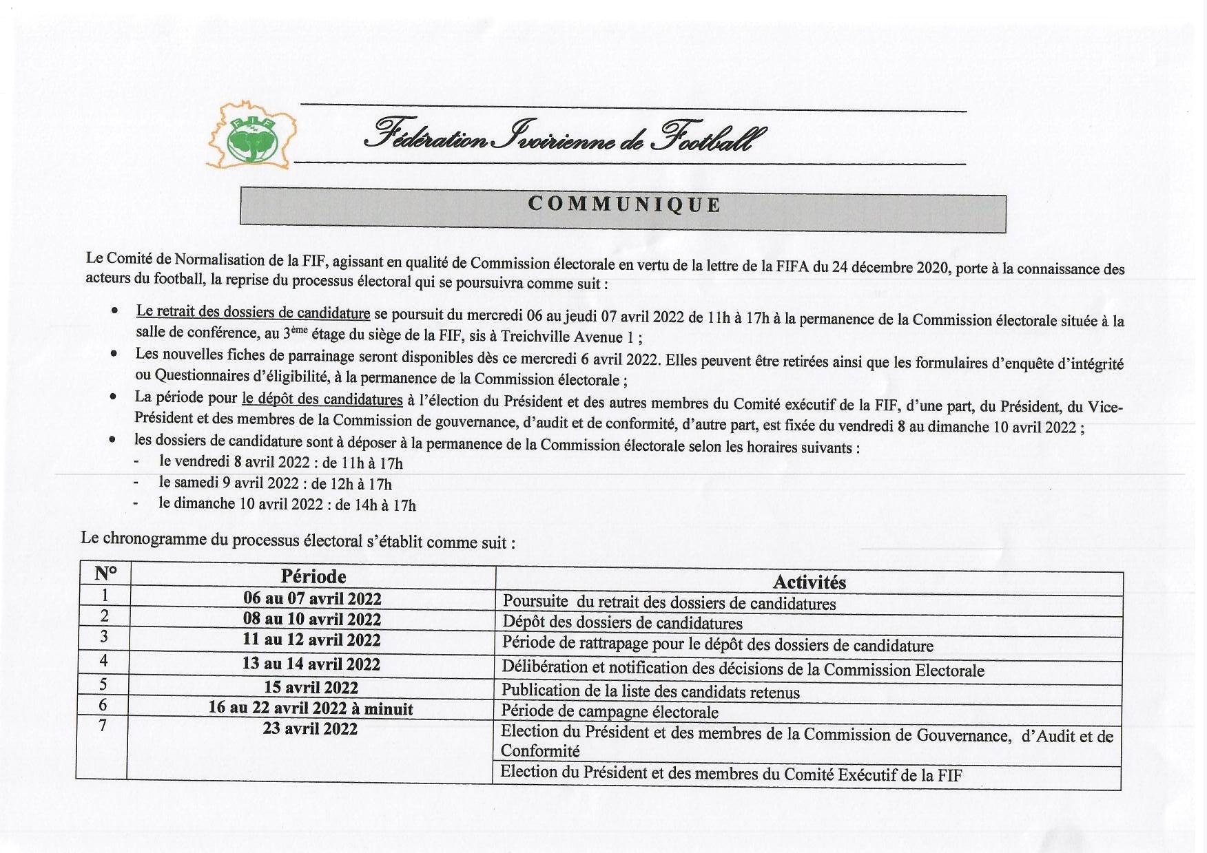 Agissant en qualité de Commission Electorale, le Comité de Normalisation de la Fédération Ivoirienne de Football (Conor-FIF) procédera à la publication de la liste des candidats retenus ce vendredi 15 avril 2022, selon le calendrier établi.
