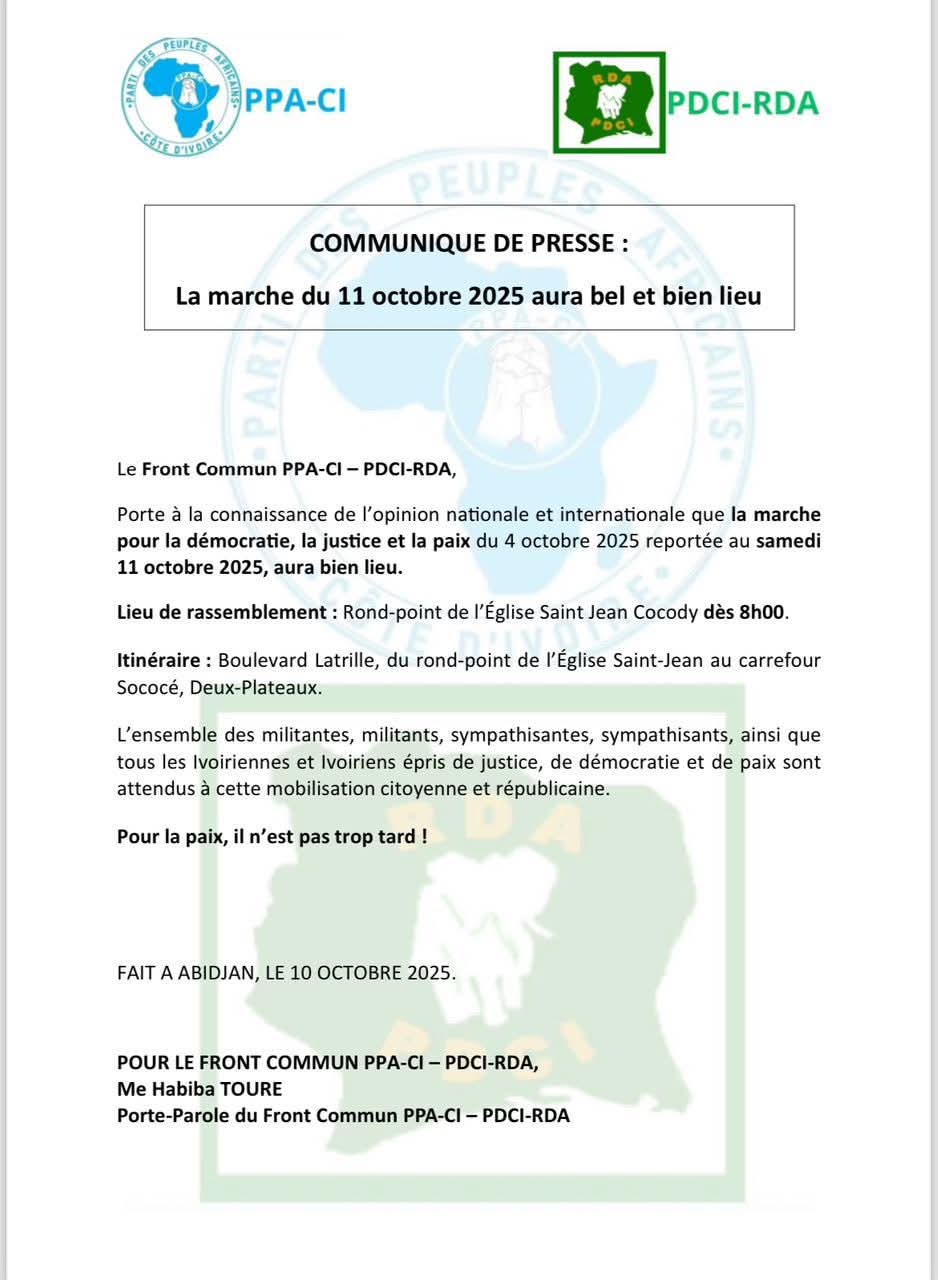 Initialement prévue pour le 4 octobre, puis reportée, la marche citoyenne initiée par le Front Commun PPA-CI – PDCI-RDA se tiendra demain samedi 11 octobre 2025. Cela a été confirmé dans un communiqué officiel signé par Me Habiba Touré, porte-parole du Front.