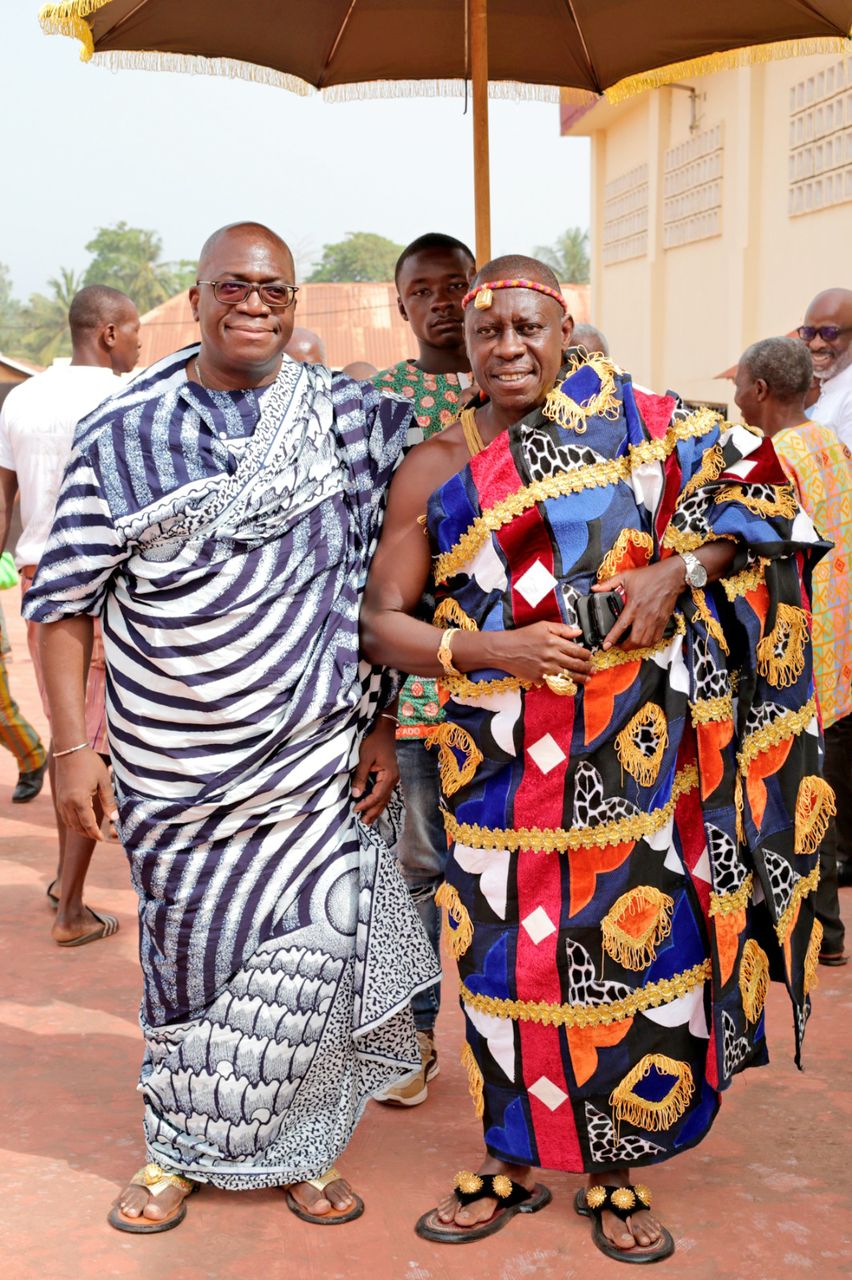 Le maire Hervé Adom Boa (à gauche) habillé dans la tradition Agni