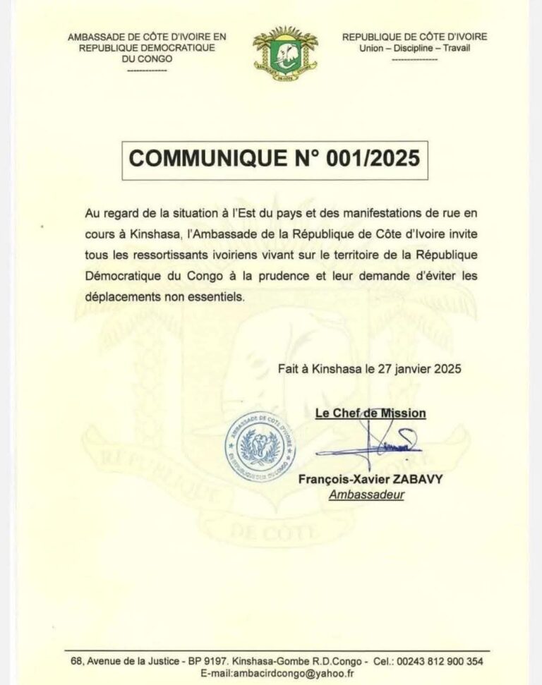 C'est dans ce contexte chaotique que la Côte d'Ivoire a appelé ses ressortissants vivant en République Démocratique du Congo a plus de vigilance. Dans un communiqué, l'Ambassade de Côte d'Ivoire a invité les ivoiriens à la prudence et à limiter les déplacements.